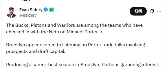 北京时间12月27日,据名记Sidery报道,勇士已经就小迈克尔-波特的交易事宜,向篮网进行过询价。雄鹿和活塞也曾与篮网有过相关接触。篮网方面似乎愿意听取关于波特的交易报价,尤其倾向于包含潜力球员和选秀权的方案。